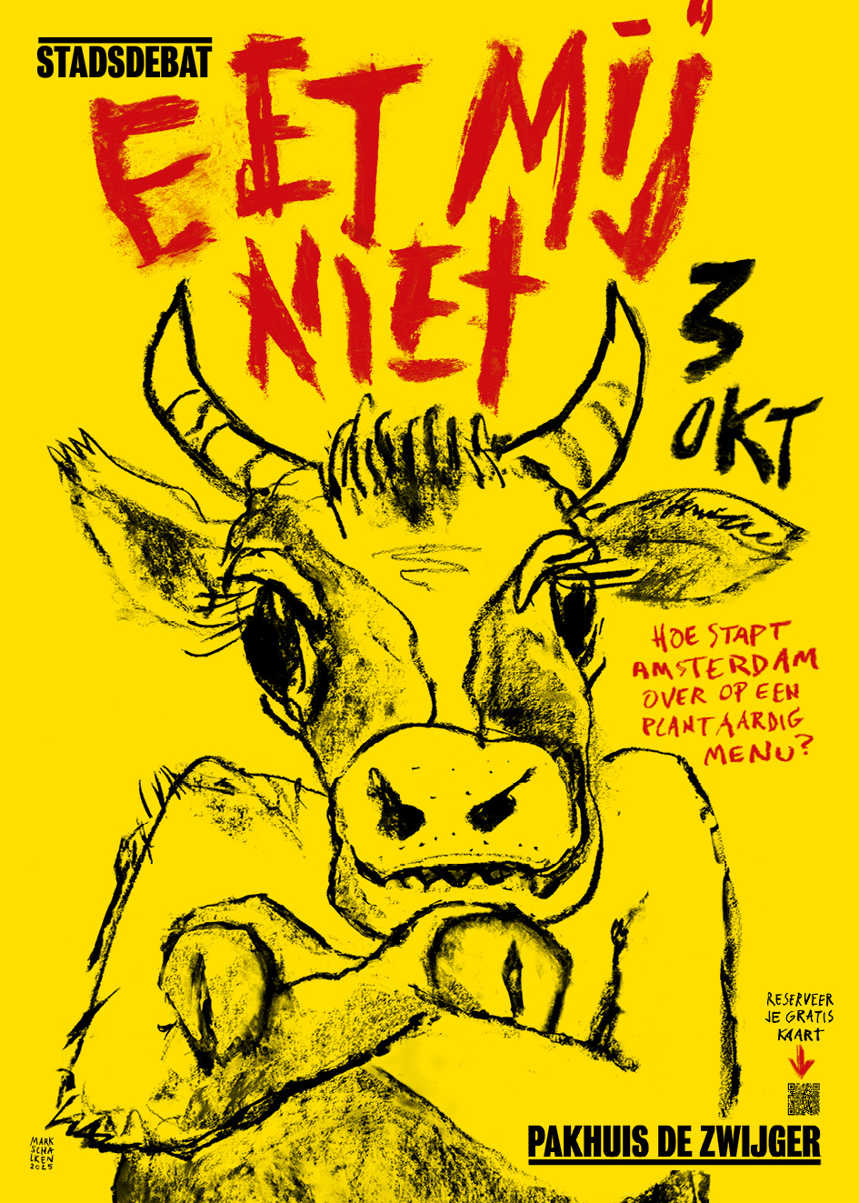 Een punky affiche voor het stadsdebat Eet mij niet, dat ik jaarlijks organiseer met Pakhuis de Zwijger (meer op hun site︎︎︎). Het beeld moet lekker knallen en mensen uitlokken om te komen. Het hing o.a. bij Boekhandel Athenaeum.