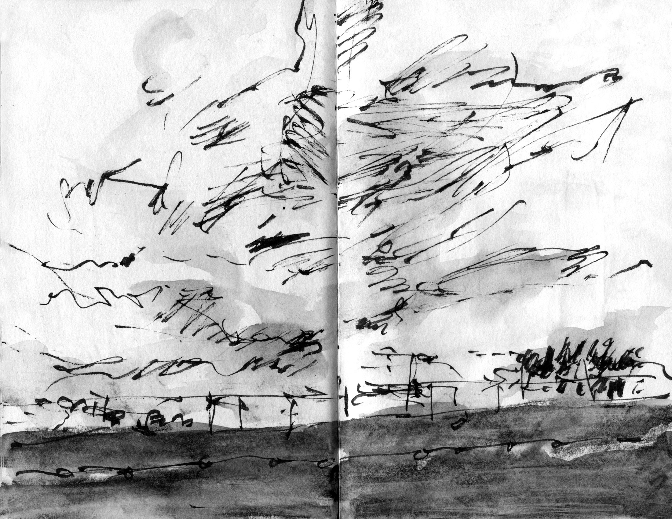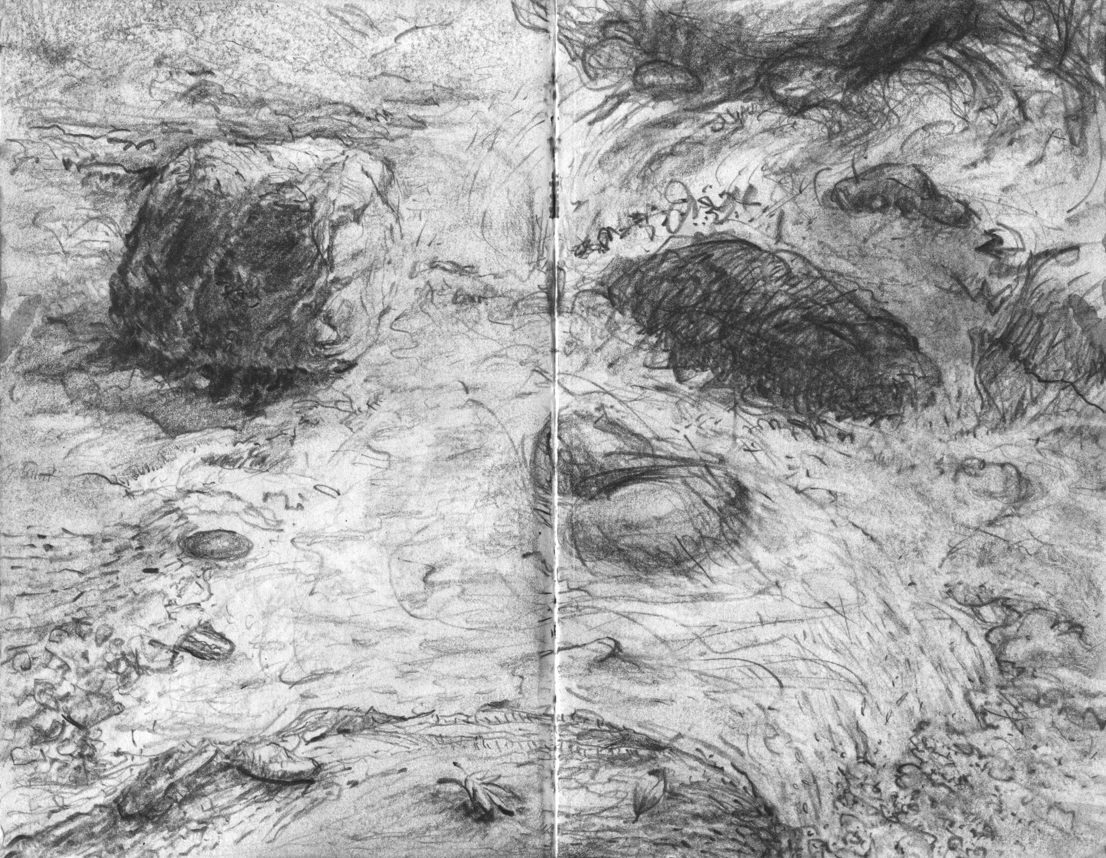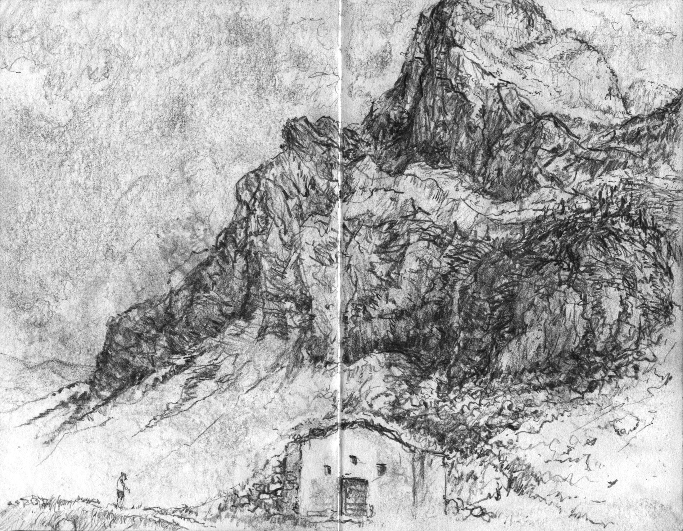 Zomer 2022: tekeningen van een wandelvakantie in de Italiaanse Alpen. Potlood, vulpen en houtskool in A5-schetsboek.