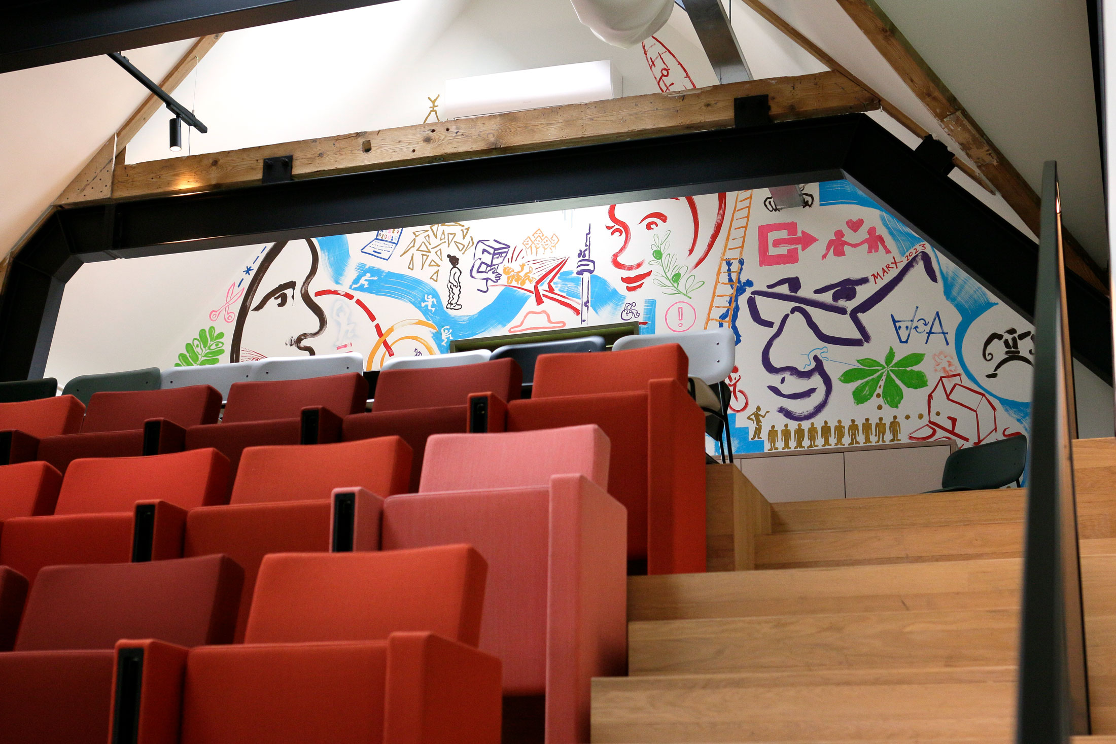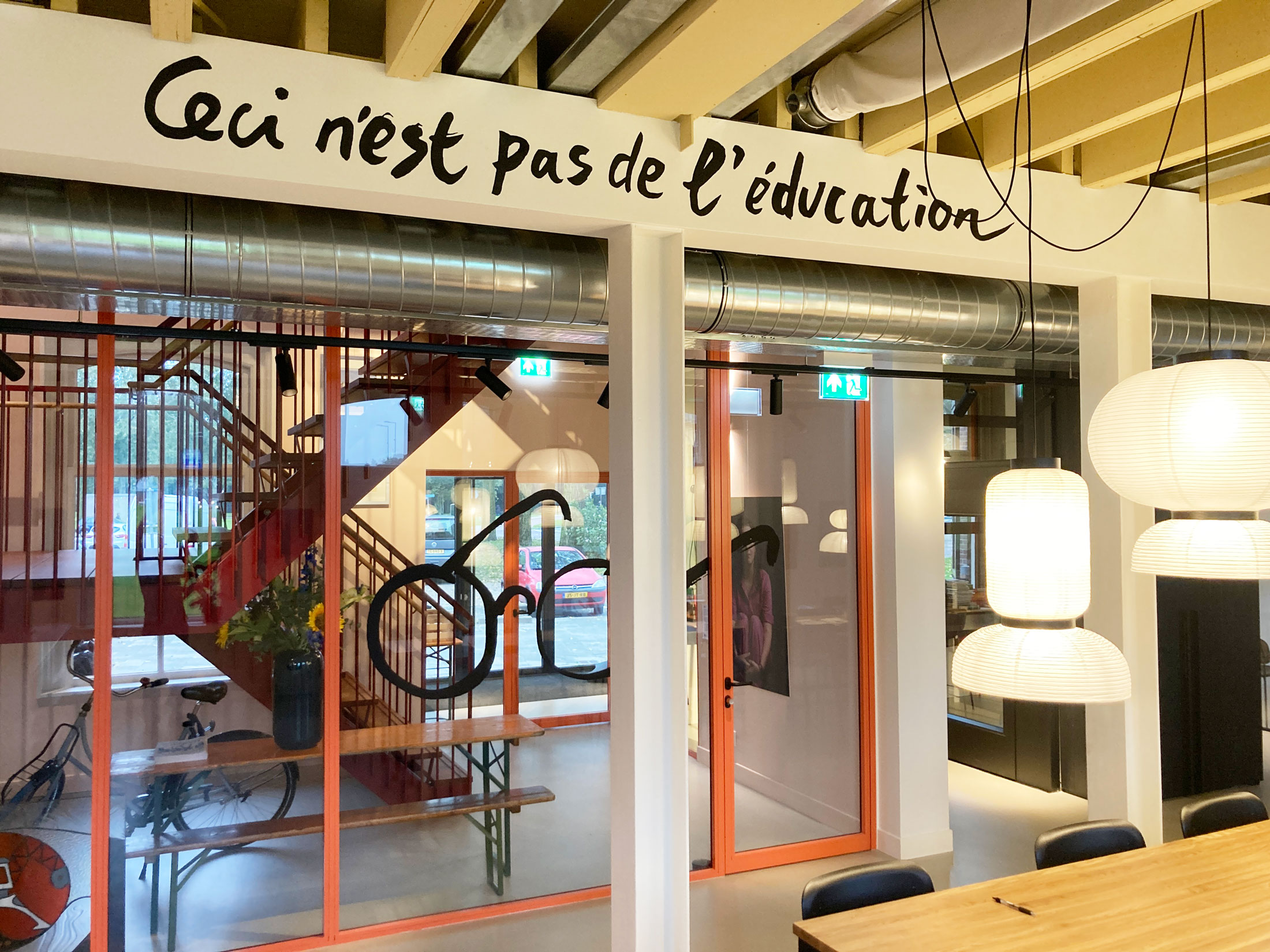 Tegelijkertijd refereren sommige elementen in het gebouw aan de geschiedenis en de achterliggende pedagogische missie, zoals een muurbord over Janusz Korczak.