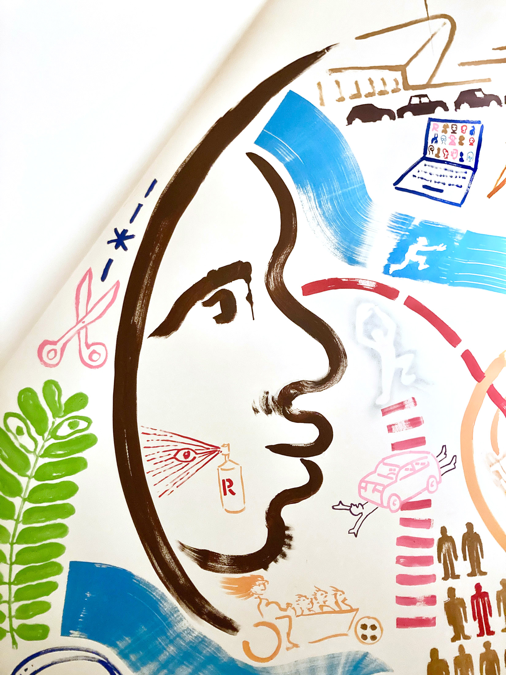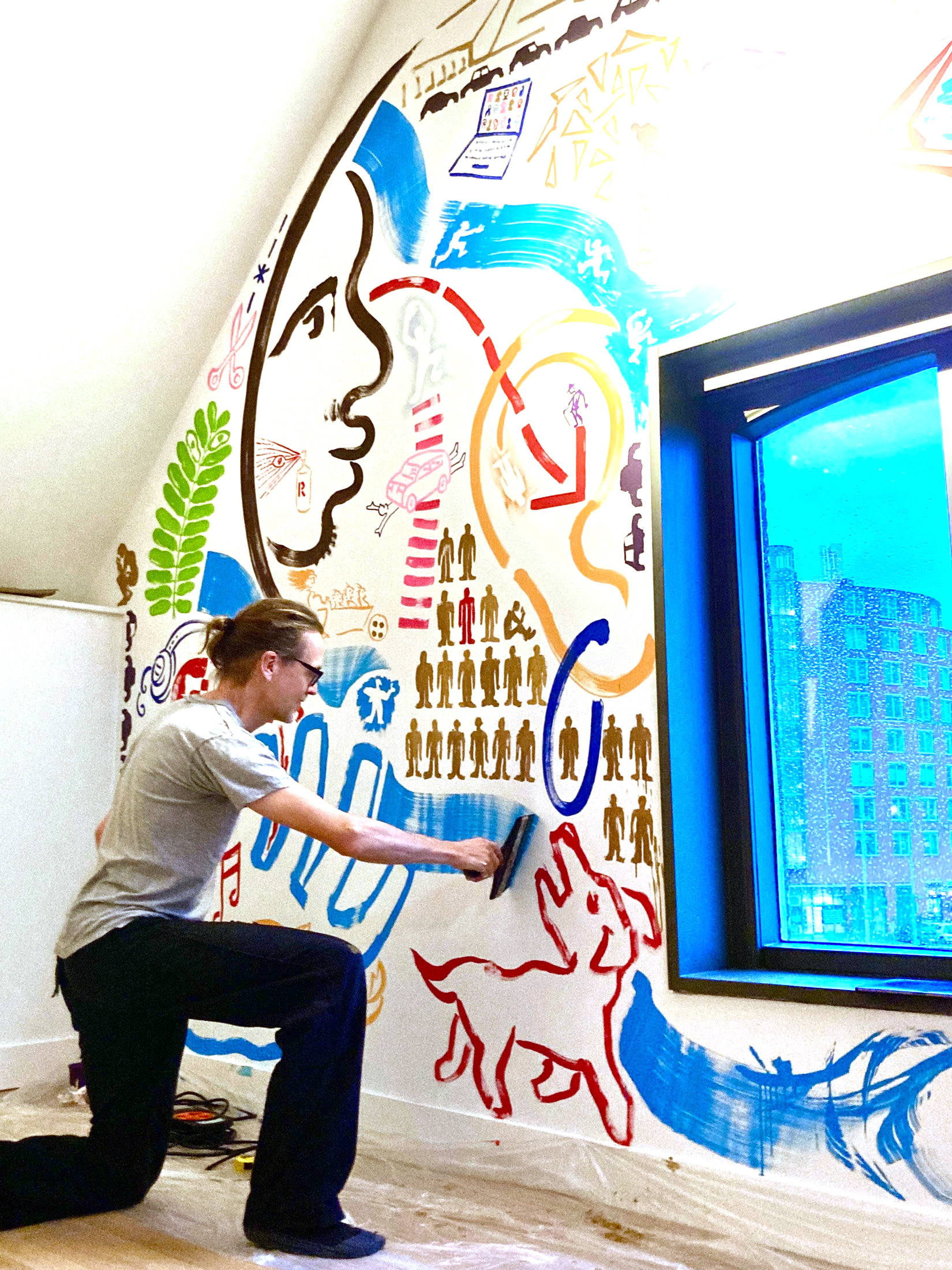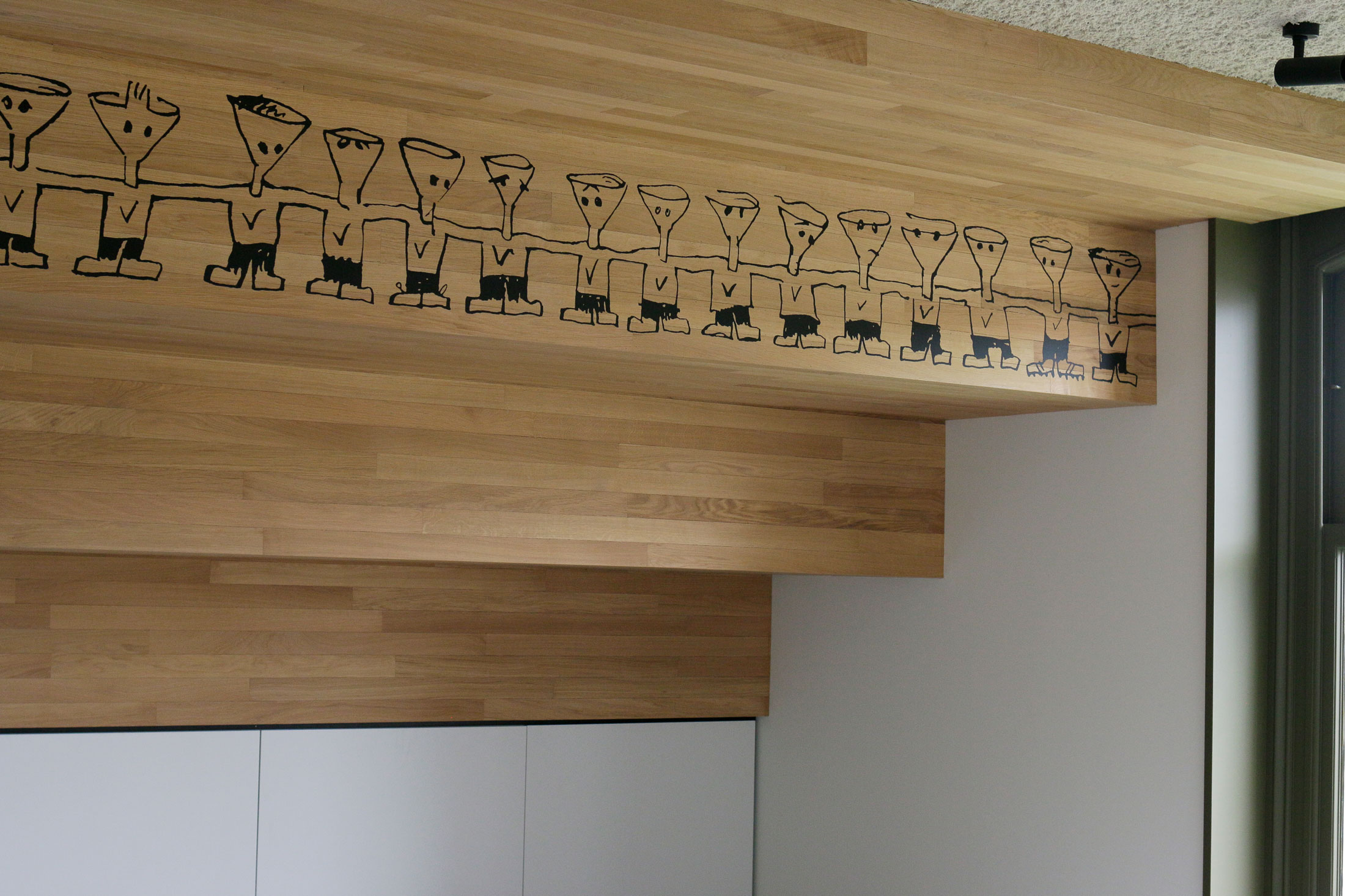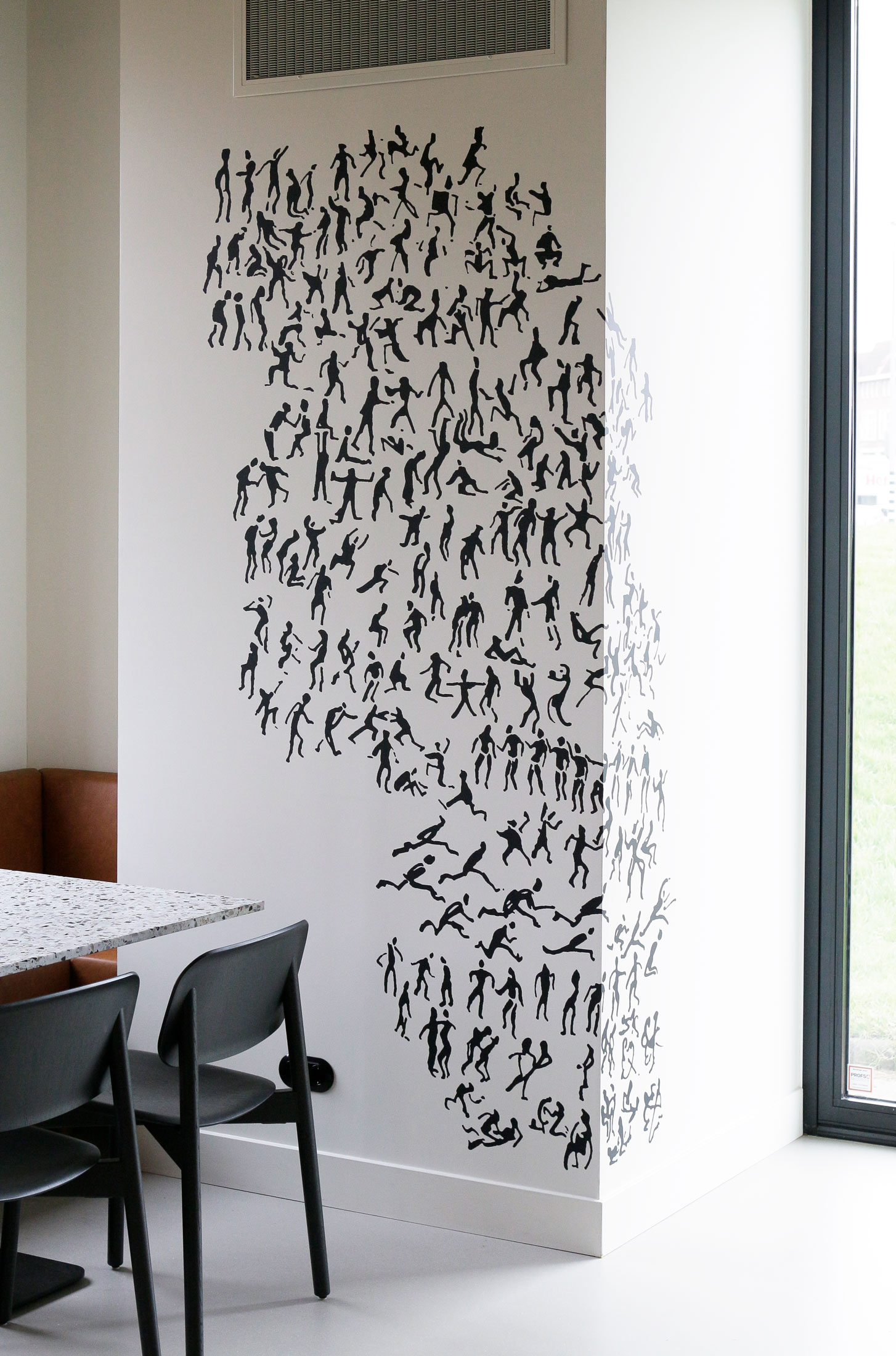 Ik digitaliseerde mijn handgeschreven letterype Funtura en paste deze toe op de muren en glazen tussenwanden van het gebouw, in de bewegwijzering en op een vloerkleed.