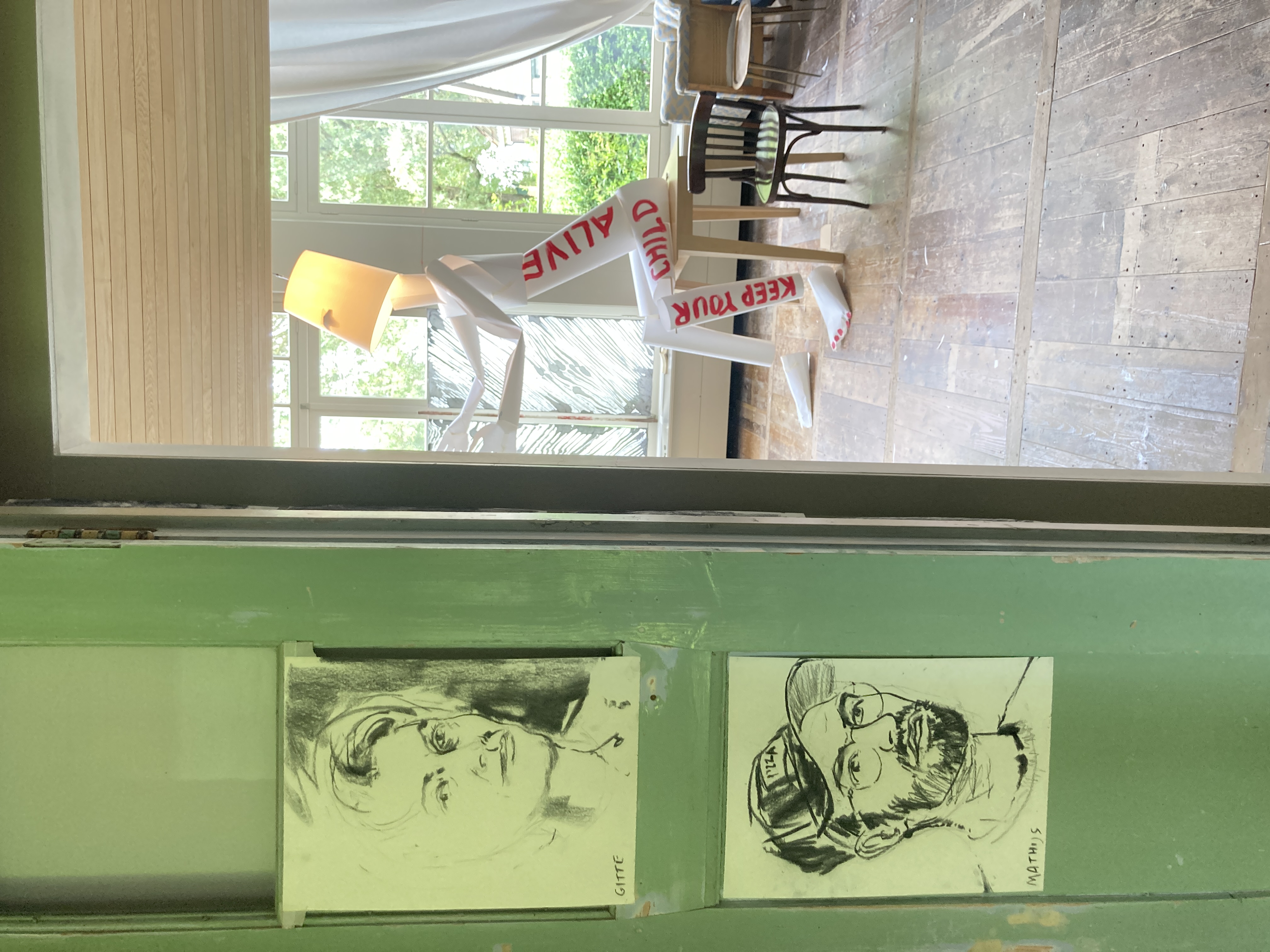 Augustus 2023 verbleef ik in het Friese Húns. Folkert van der Hoek bouwde daar het dorpsschooltje om tot gastatelier. Geïnspireerd door gebouw, buurtbewoners en omgeving maakte ik spontaan tekenwerk, bijna dagelijks wisselend van aanpak en stijl. Tot slot maakte ik een papieren installatie, waarvan het motto – Keep your child alive – komt uit een podcast-interview met Brian Elstak.