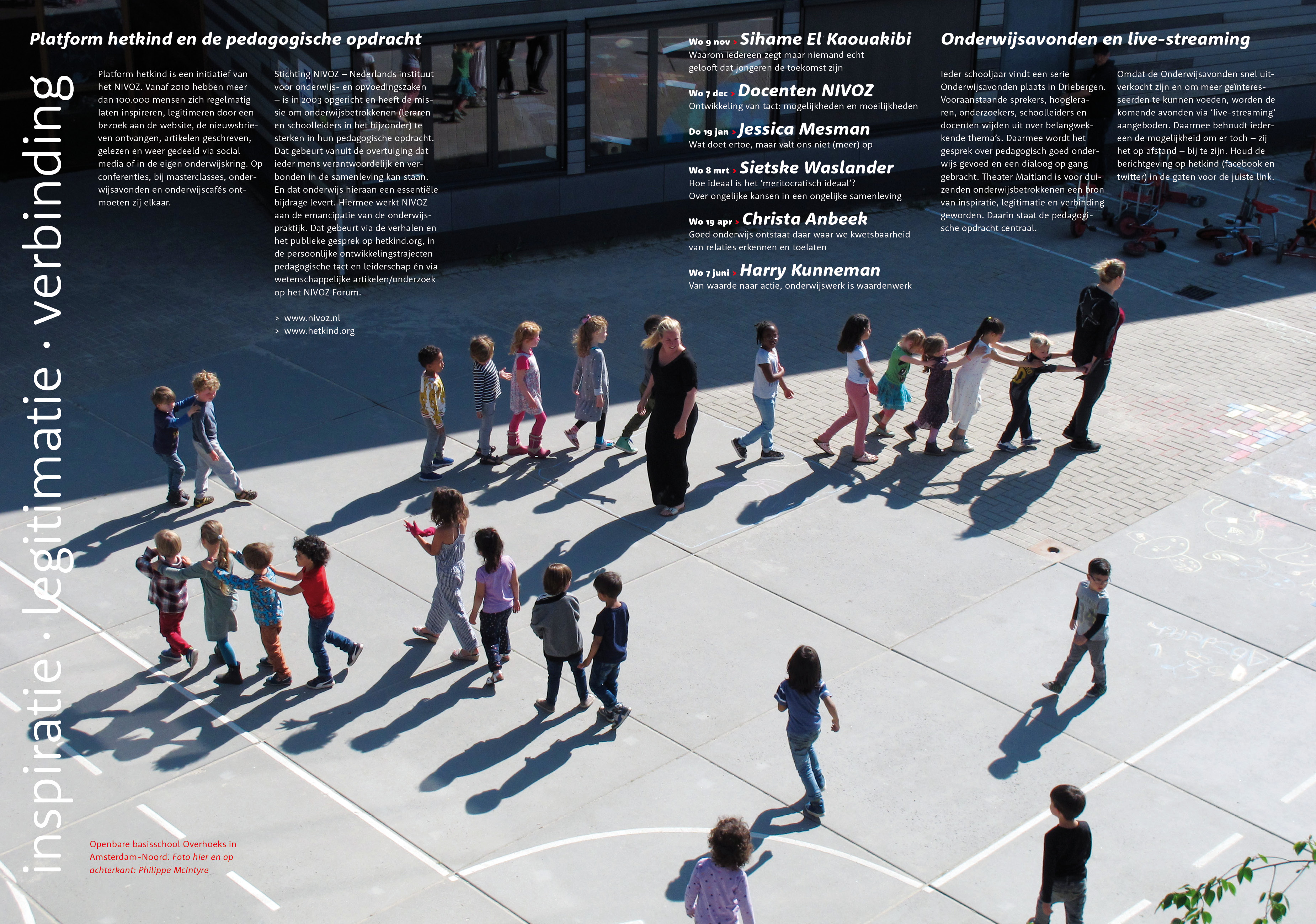 Achter ieder onderwijs liggen waardes en mensbeelden. Voor stichting Nivoz staat de empathische relatie tussen leraar en leerling centraal. Albert Hennipman en ik zijn Nivoz’ ontwerppartners in hun dialoog met leraren, directies, wetenschappers en ouders. Samen met redacteur Rob van der Poel en anderen ontwikkelen we tijdschriften, boeken, congresverslagen en meer.